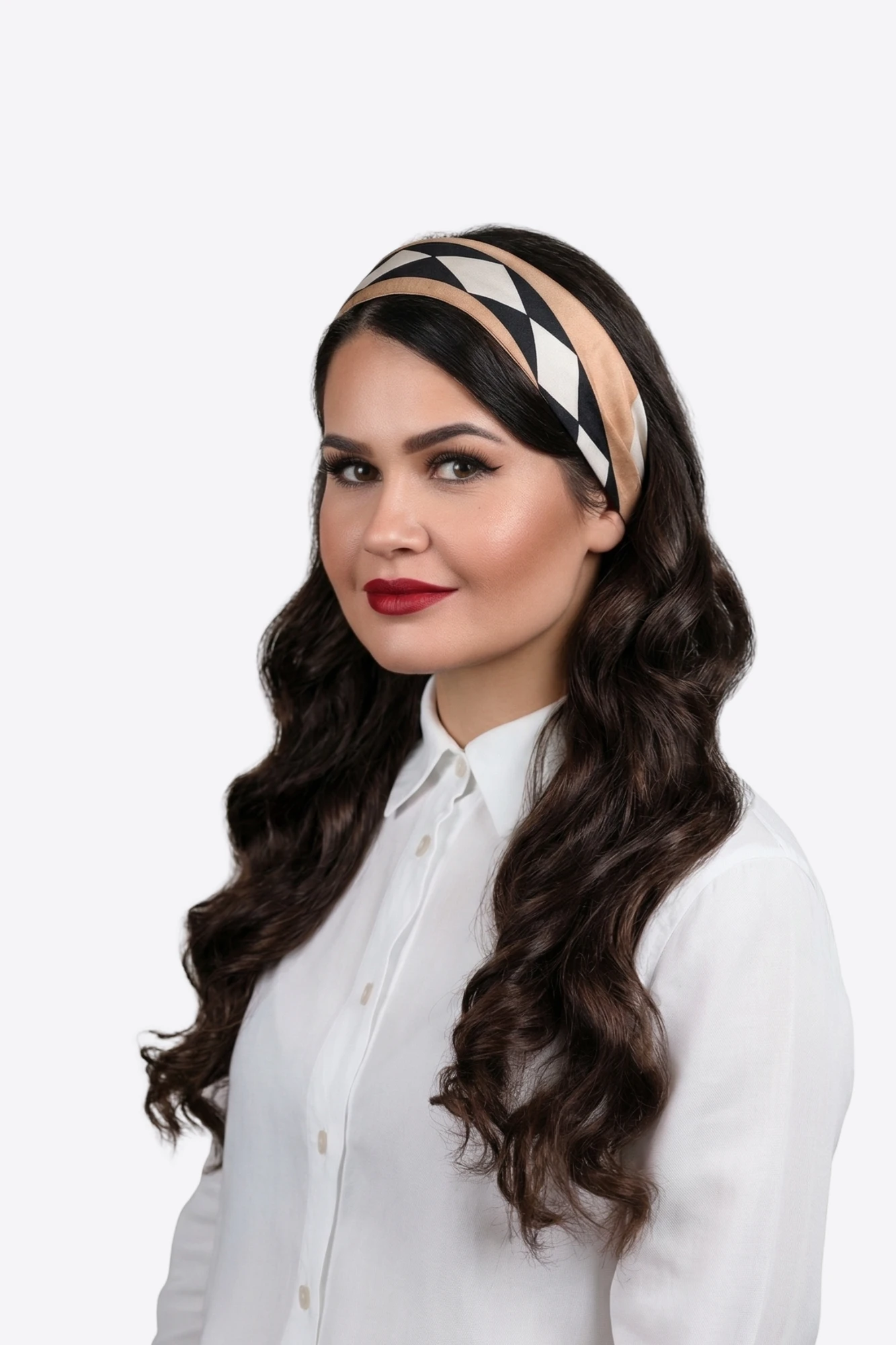 „Iluzja Królowej” to twilly, które przenosi Cię do świata, gdzie rzeczywistość igra z wyobraźnią, a każda kobieta staje się główną bohaterką własnej rozgrywki. Hipnotyzujący wzór z wirującymi rombami, zakrzywionymi liniami i rozsypanymi szachowymi figurami sprawia, że trudno oderwać od niej wzrok – to taniec logiki i zmysłów.